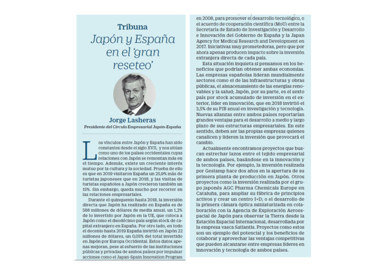 Cinco Días ha publicado el artículo de opinión ‘España y Japón en el Gran Reseteo’. La tribuna, que versa sobre la necesidad de potenciar los puentes construidos sobre la innovación y la tecnología entre España Japón, está firmada por Jorge Lasheras, presidente del Círculo Empresarial Japón-España. Puede leer el artículo completo en el siguiente enlace.